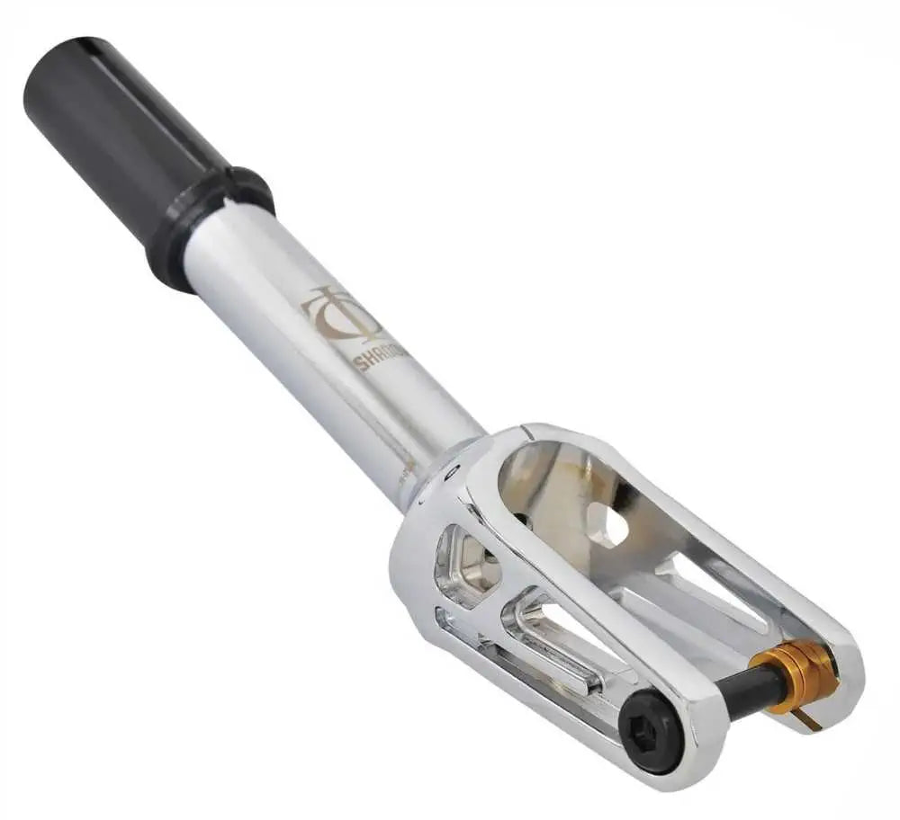 The Shadow fork is one of the most progressive forks on the market. Made from forged 6061 T6 Aluminium, the Shadow fork fits up to 125mm high wheels and a whopping 28mm core with virtually no comprise on weight. With the scooter market changing rapidly, we strongly believe that the fatter core design is on the rise and is here to stay. The fork design is beautifully sculptured and matches seamlessly with your head tube.